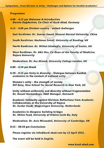 6:30 – 8:15 pm Unity in diversity – Dialogue between Kurdish academics in the context of national unity